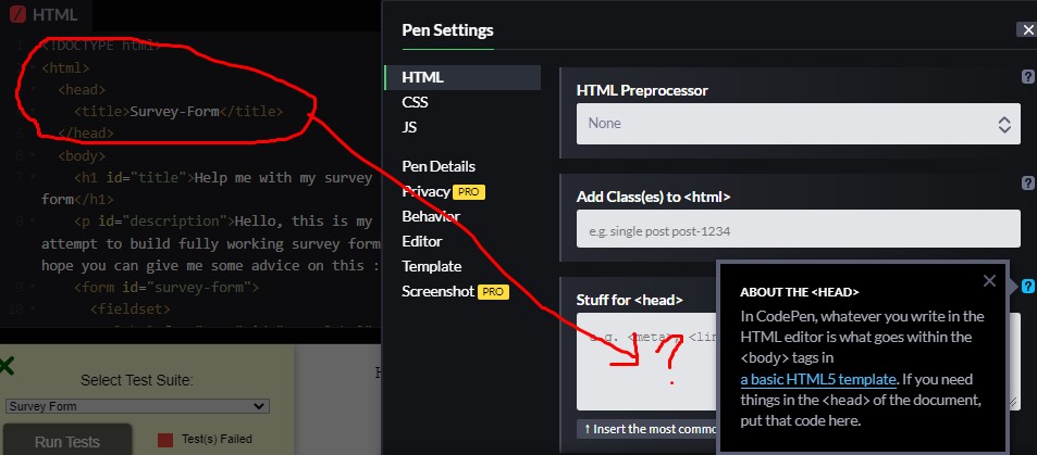 Blockquote* Codepen provides the boilerplate for you. It only expects the code you’d put within the body element in the HTML editor. (No need to include the body tags). For anything you want to add to the <head> element click on the ‘Settings’ button, then HTML and add it into the ‘Stuff for ’ box.