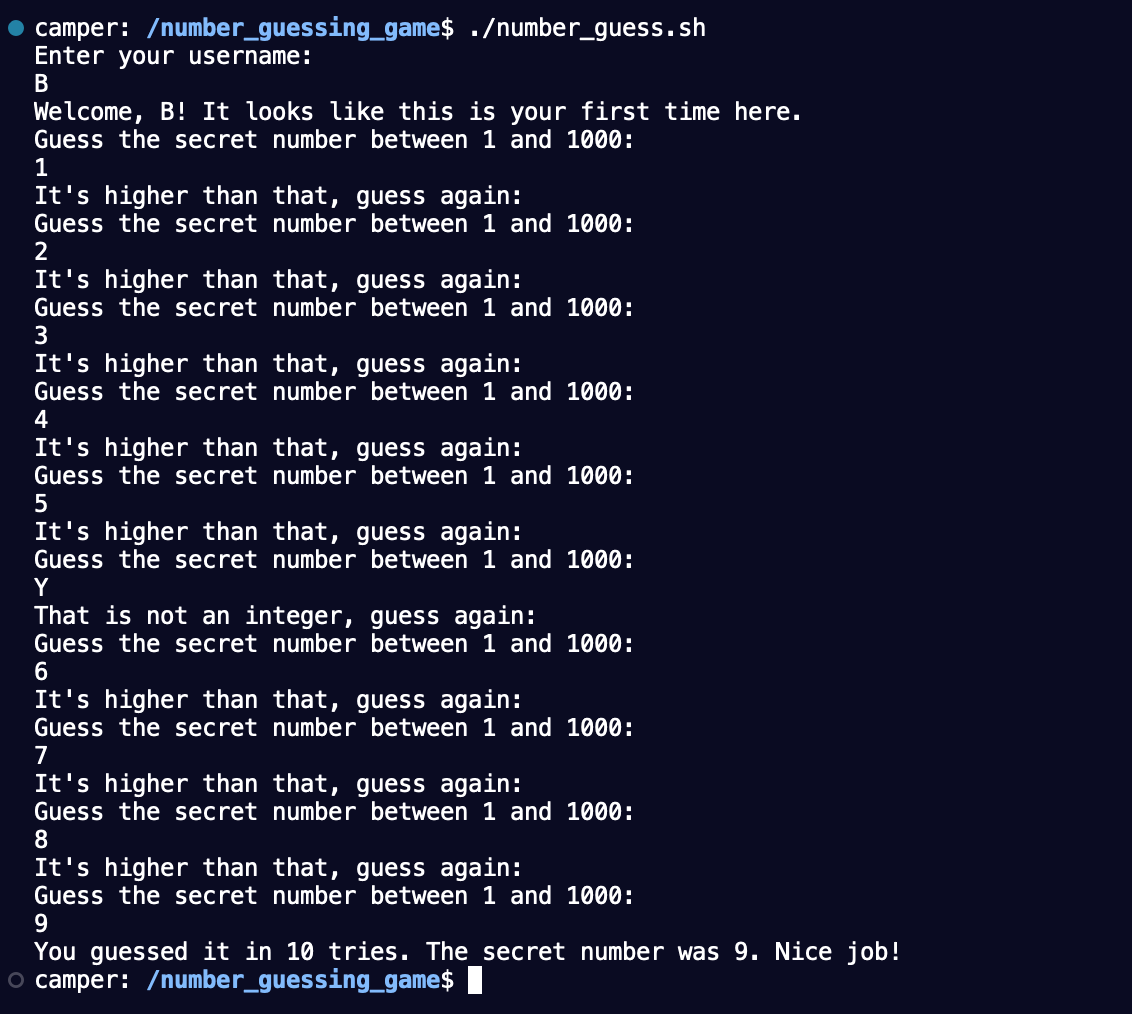 echo -e "\nYou guessed it in $NUMBER_OF_GUESSES tries. The secret number was $SECRET_NUMBER. Nice job!\n"