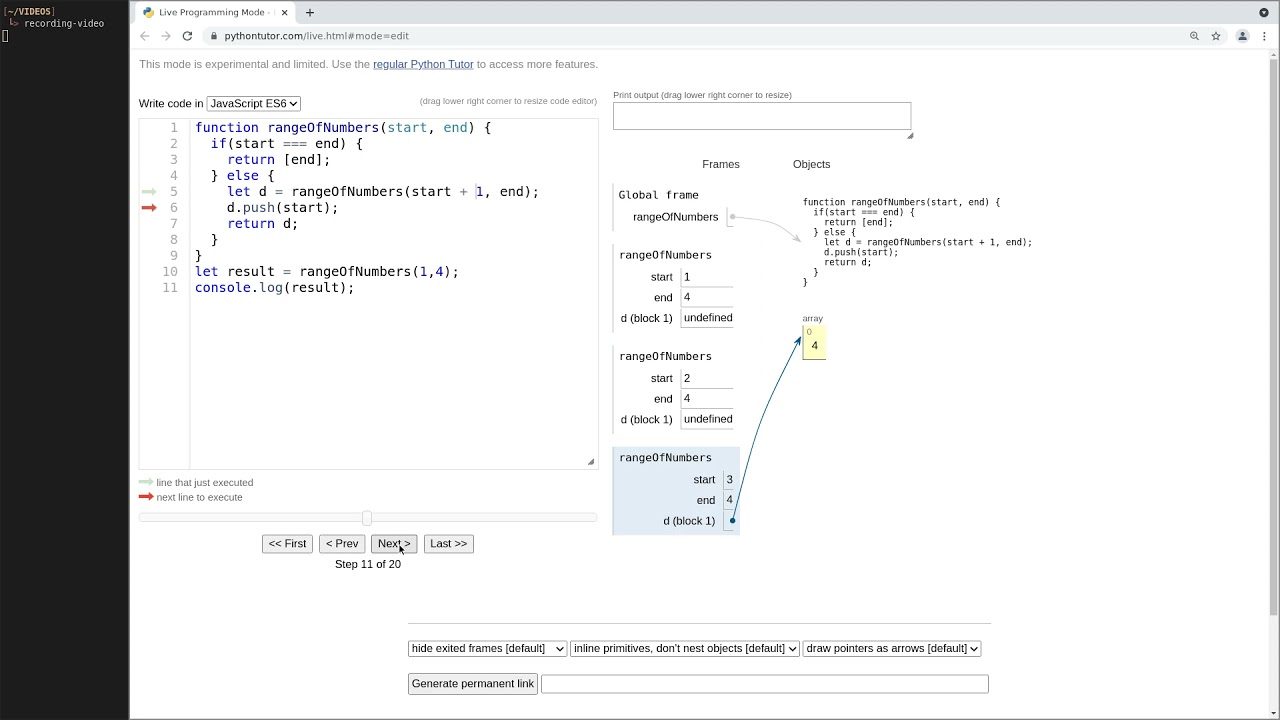 let d = rangeOfNumbers(start + 1, end); // recursive case