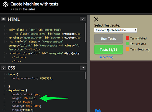 I refactored my old Quote Machine a little bit for test-suites, bit it doesnāt pass the Layout test. The quote-box was centered with margin: 2% auto; - it didnāt pass. I added flexbox in the body tag, centered it with flexbox, and now it passes only if I donāt have any margin on box-quote. If I add margin-top or margin: 2% auto; , test fails. But without it quote-box is just on top and itās kinda ugly. http://codepen.io/enk/pen/PWedvY Hereās my pen.