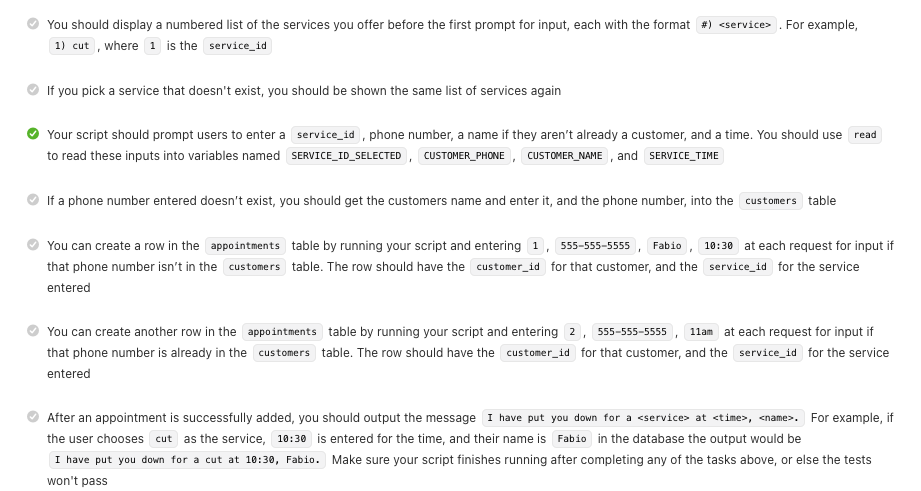 I’m getting inconsistent test results when attempting to pass the Salon Appointment Scheduler. The last few tests were passing at first, but now they are not. However, it seems like my script is doing what’s required based on the user stories.