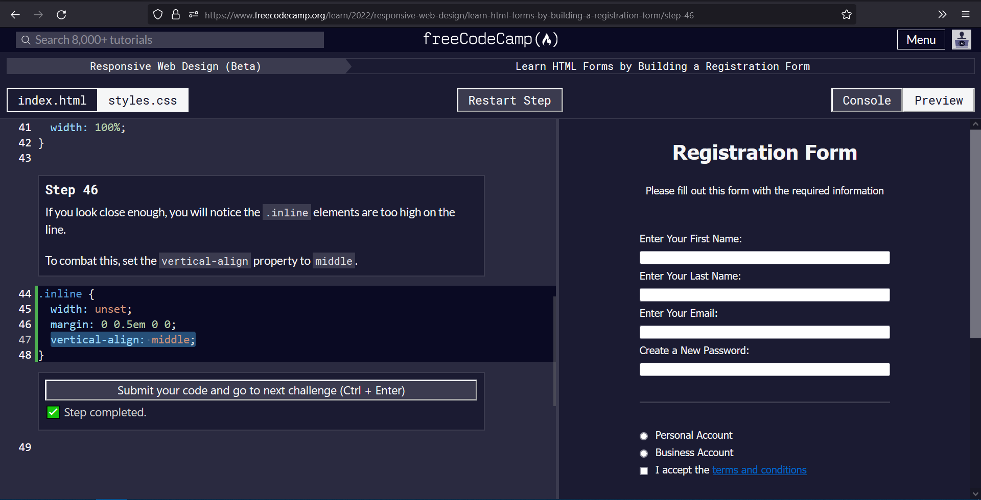 Link to the challenge - https://www.freecodecamp.org/learn/2022/responsive-web-design/learn-html-forms-by-building-a-registration-form/step-46